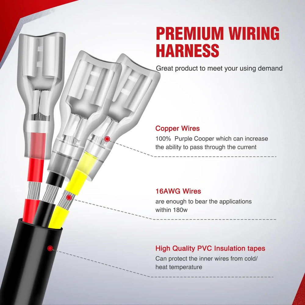 - Package includes: 1 x wiring harness kit, 3 x blade fuses, 3 x connectors, 1x wiring diagram