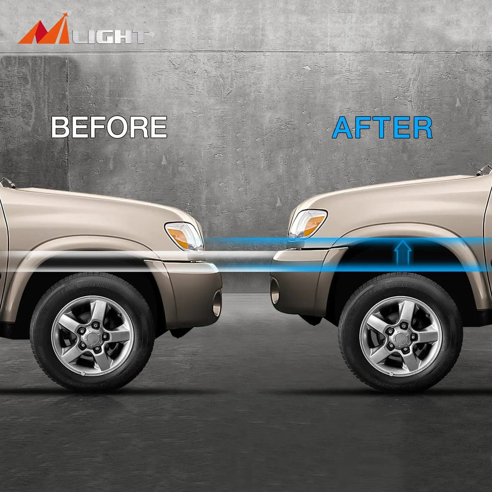 NOTE: This Leveling Kit will raise the front of the truck by 2 inches, but the actual thickness is less than 2 inches. This is due to suspension geometry, and the ratio between lift height and kit thickness is not 1:1. And we suggest measure from the ground to the fender