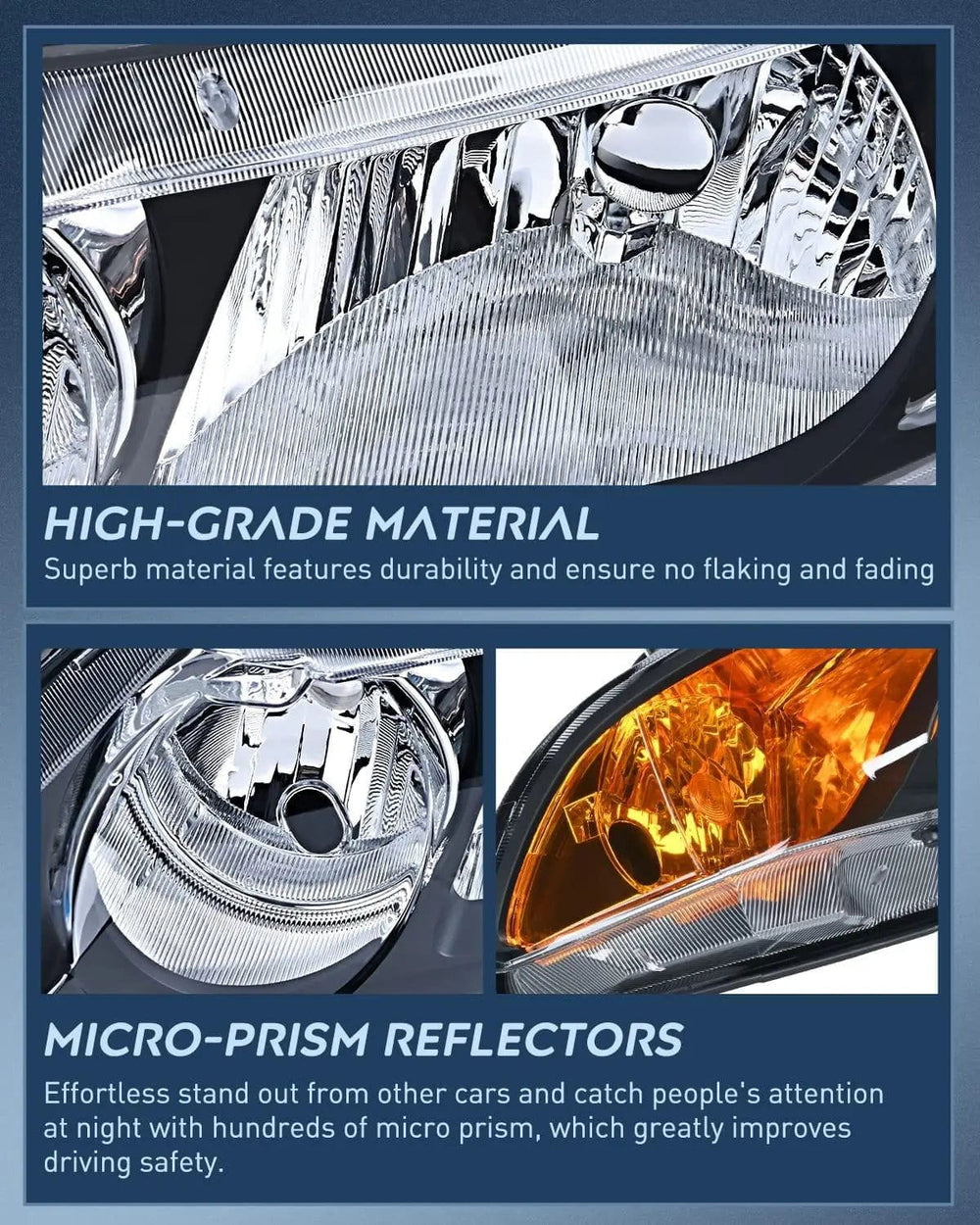 Upgrade Material, To meet or exceed the OE ones in function upgraded materials, which are UV & shock-resistant to prevent yellowing or cracking for a longer lifespan