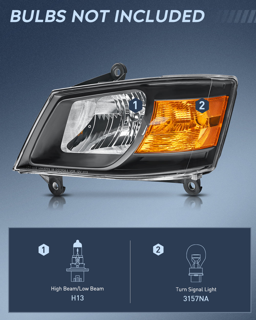 Compatibility: The headlight assemblies are compatible with 2008 2009 2010 Dodge Grand Caravan. High/Low beam bulb type: H13. Bulbs are not included.