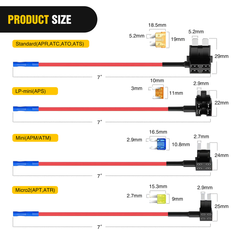 - Great Compatibility: Automotive and non-automotive use for Cars, Trucks, SUVs, ATVs, UTVs, Campers RVs,Motorcycles,Boats,snowmobiles,and most general DC applications etc,covering such components as radio, light,etc. Use when hardwiring or adding LED strips, dash cams or other electronic devices that require direct wiring into the fuse box