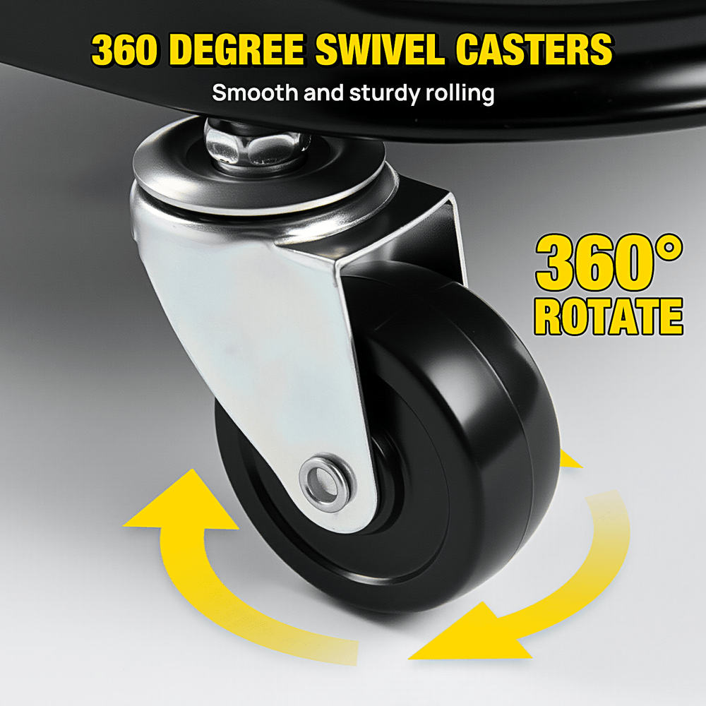 360 Degree Swivel Casters: our rolling mechanic stools are equipped with 360 degree swivel casters for easy manoeuvrability in tight spaces. Slides smoothly in any direction, providing flexibility and ease of use.