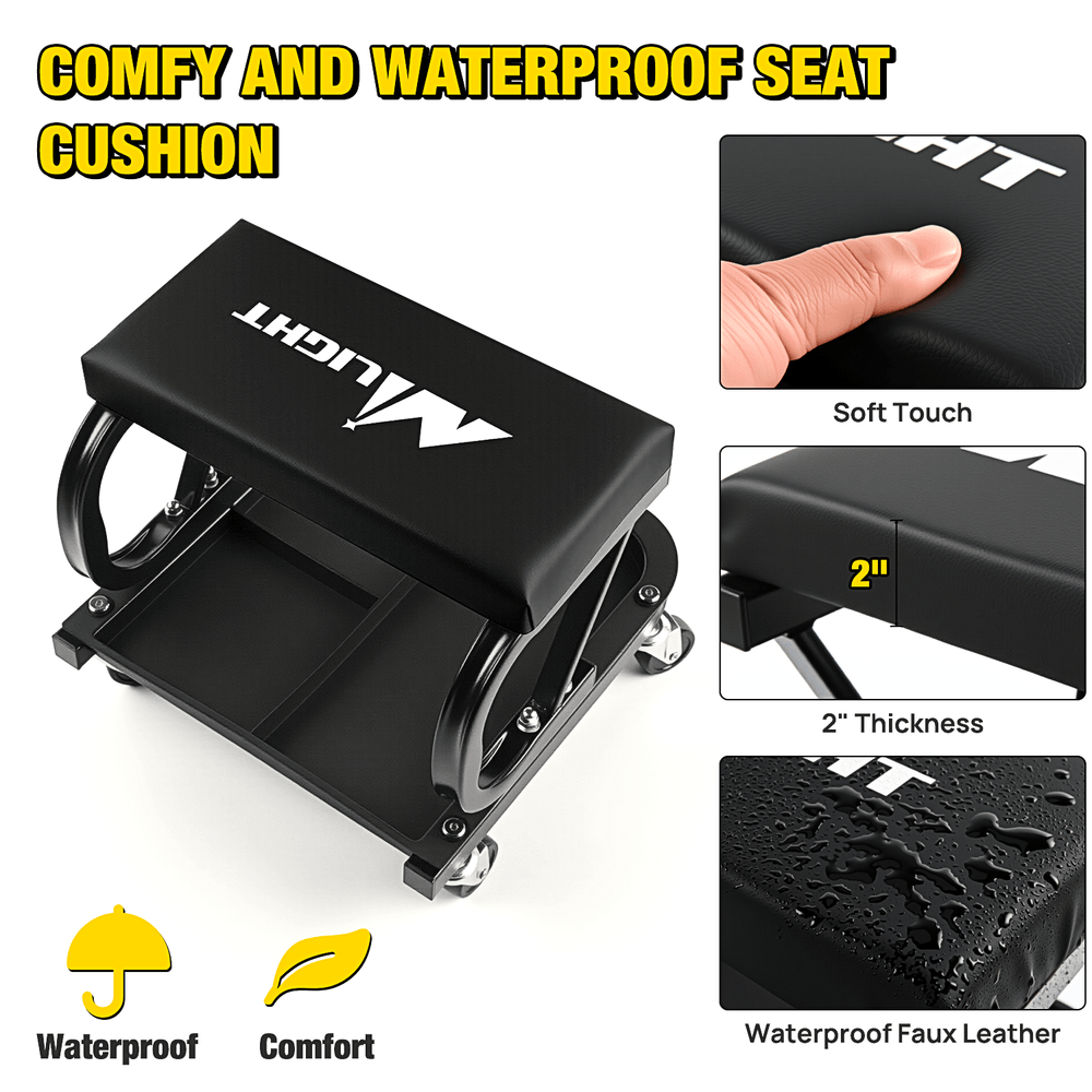 - Segmented Tool Tray: Featuring a segmented tool tray, our rolling creeper seat provides convenient storage for your tools and small parts. This design keeps your essentials organized and within reach.