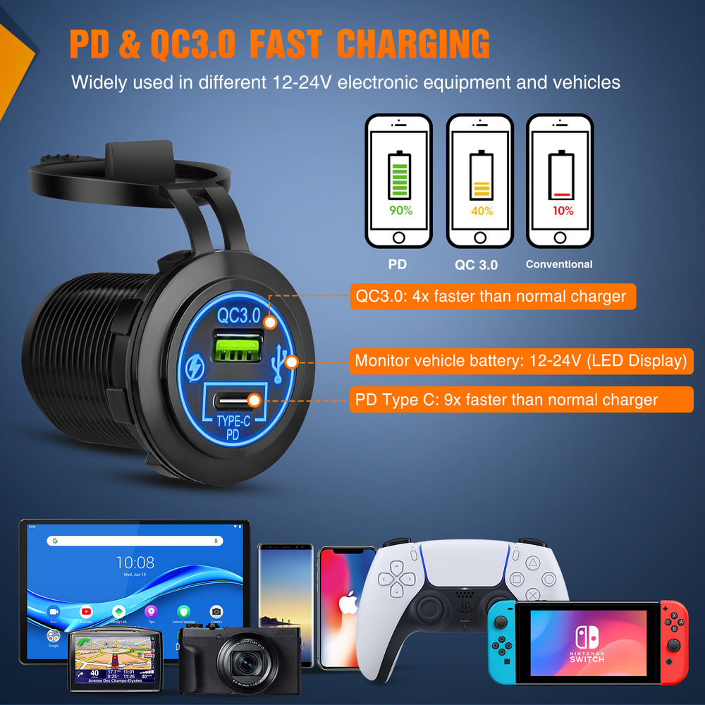 - Multi-function: 4 gang switch panel with power save switch, voltmeter, PD type-c and QC 3.0 USB charger, and cigarette socket, great for all types of circuit control, charging needs. All-in-one design can be DIY used to control any vehicle electrical appliance. Universally fit for 12V-24V vehicles, widely applicable for trucks, jeeps, trailers, RVs, caravans, buses, marine boats, yachts, etc