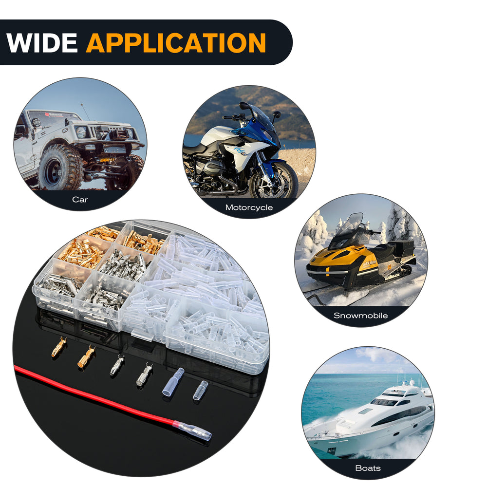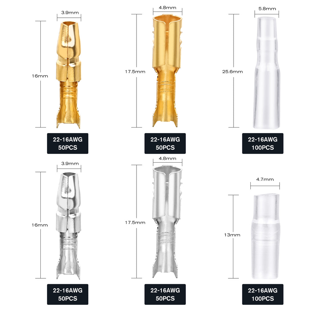 - Package Includes: 50pcs silver male bullet connectors+ 50pcs silver female bullet connectors+ 50pcs gold male bullet connectors+ 50pcs gold female bullet connectors+ 100pcs male insulation sleeve+100pcs female insulation sleeve total 400 PCS.