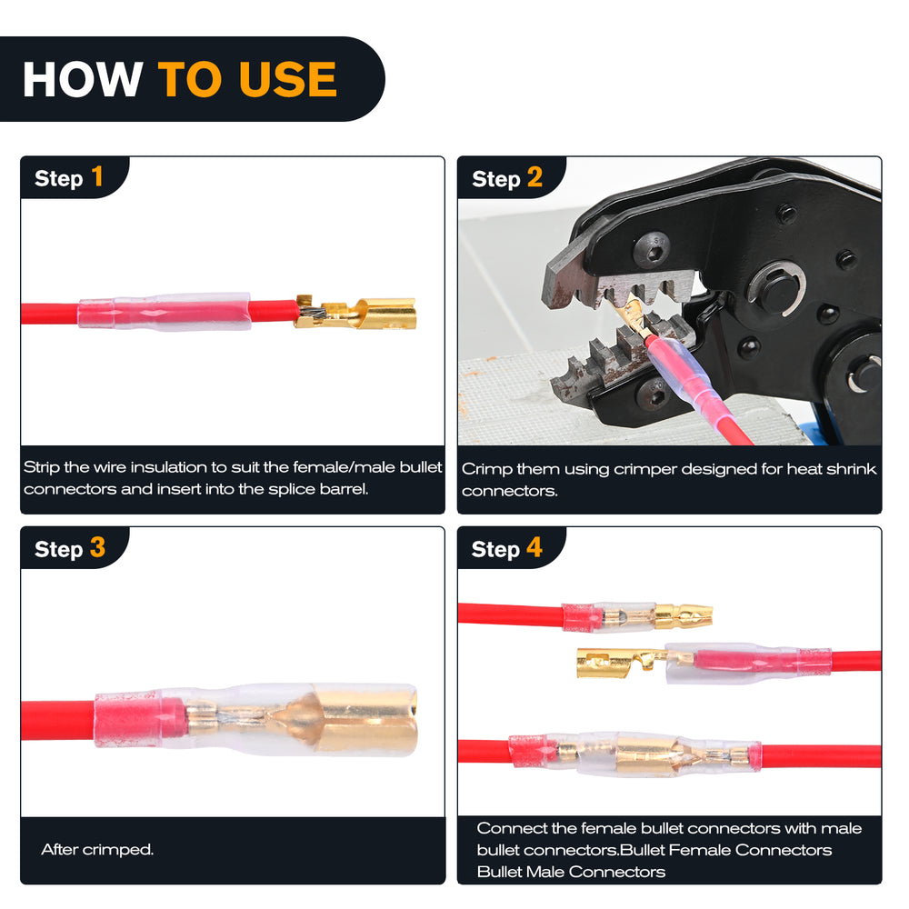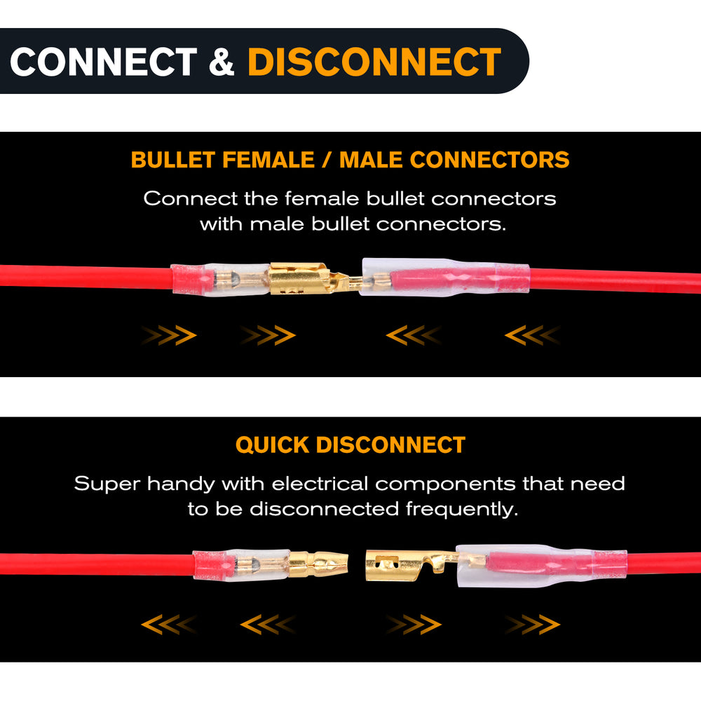 - Easy To Use: Prepare a crimp connector and 22-16AWG wire to crimp male and female bullet connectors in a few seconds, and easily connect male and female terminals without welding. You can also disconnect the male and female terminals when not needed. Save your time and improve work efficiency.