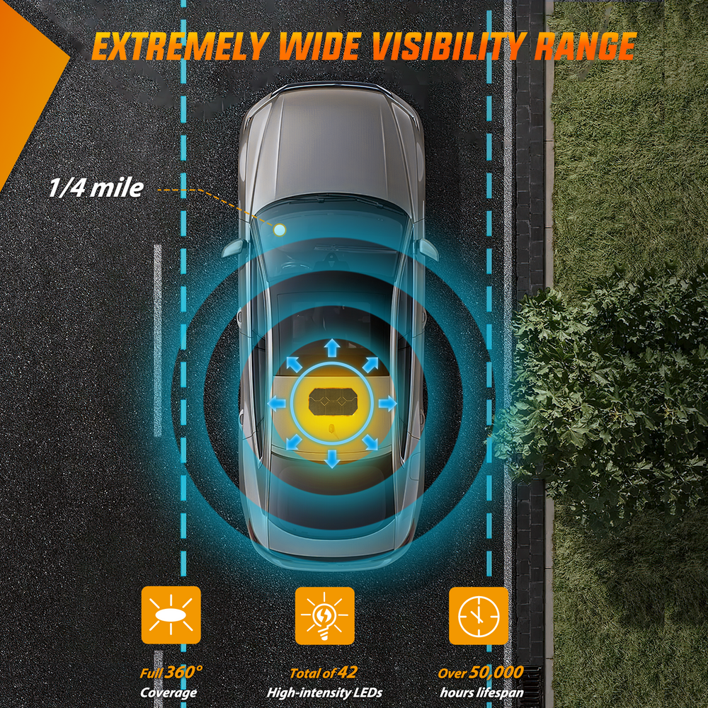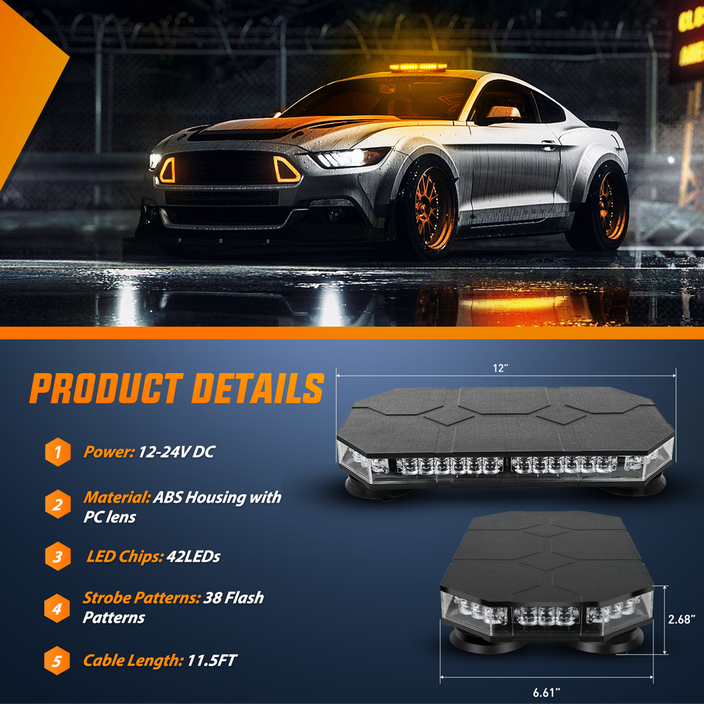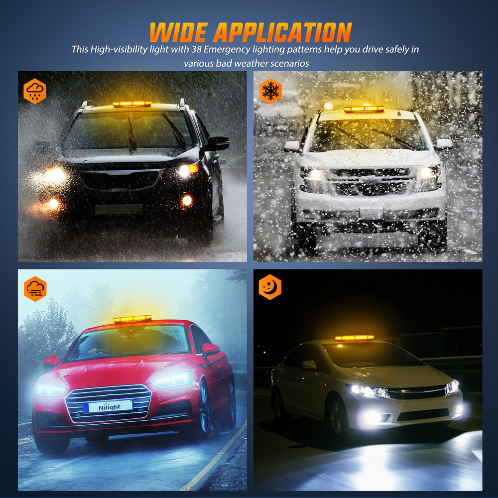 - High Visibility: Nilight amber car roof top strobe light has a total of 42 high-intensity Led chips. provided maximum illuminate coverage and be visible from greater distance. Visible in daylight, midnight, rainy, foggy or snow days.