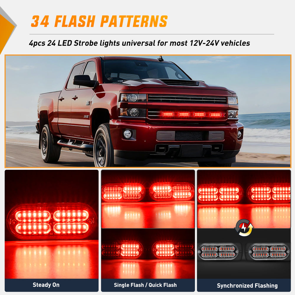 4PCS 24LED Emergency Strobe lights 12V 24V Red Surface Mount Grille Hazard Safety Warning Light Sync Feature Side Flashing Marker Flash for Car Truck Campers
