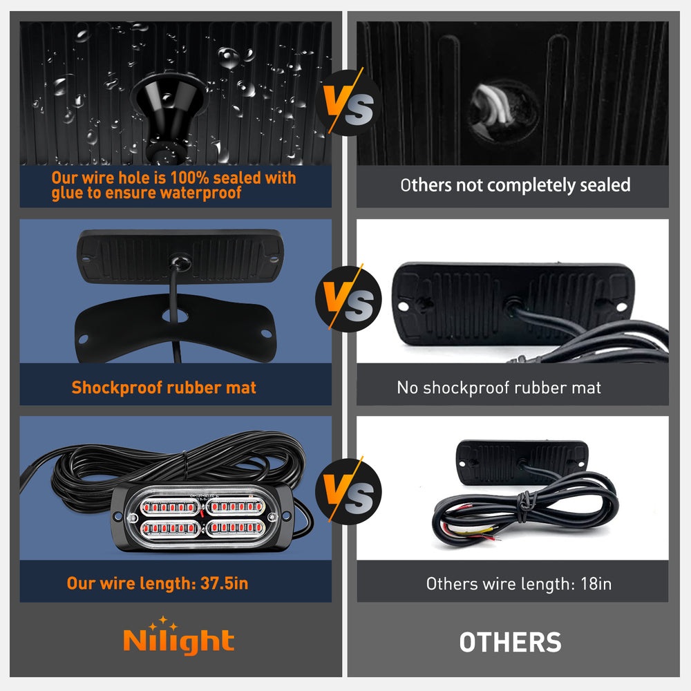- Super Bright: Nilight 4Pcs Surface Mount Strobe Lights are consists of 4pcs double row 24 LED chips, provided maximum illuminate coverage and be visible from greater distance. Visible in daylight, midnight, rainy, foggy or snow days