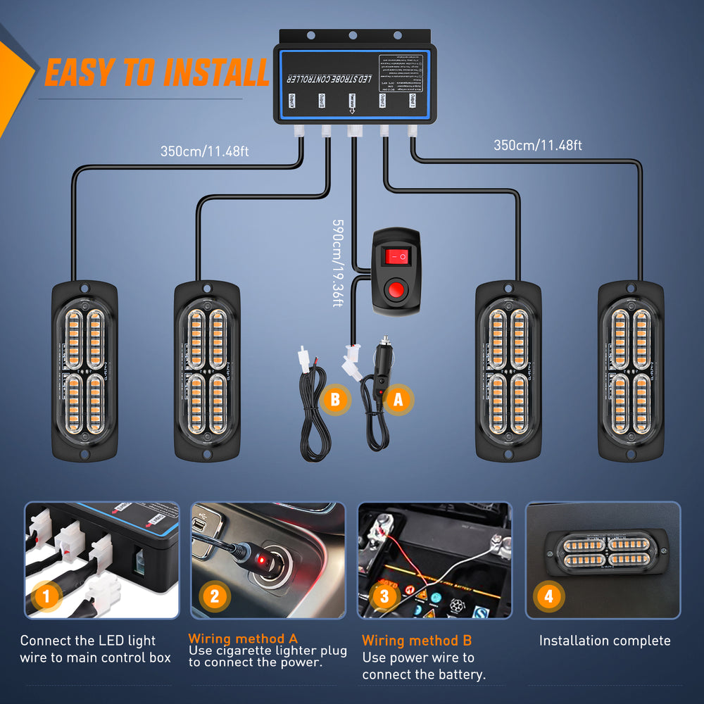- Easy to Install: Upgrade design, this emergency strobe lights with main control box for free wiring installation, it can perfectly synchronized your lights. 11.48FT long wire of each raw of light can meet the installation needs of various large vehicles. Protective mounting gaskets and screws are included for easy installation