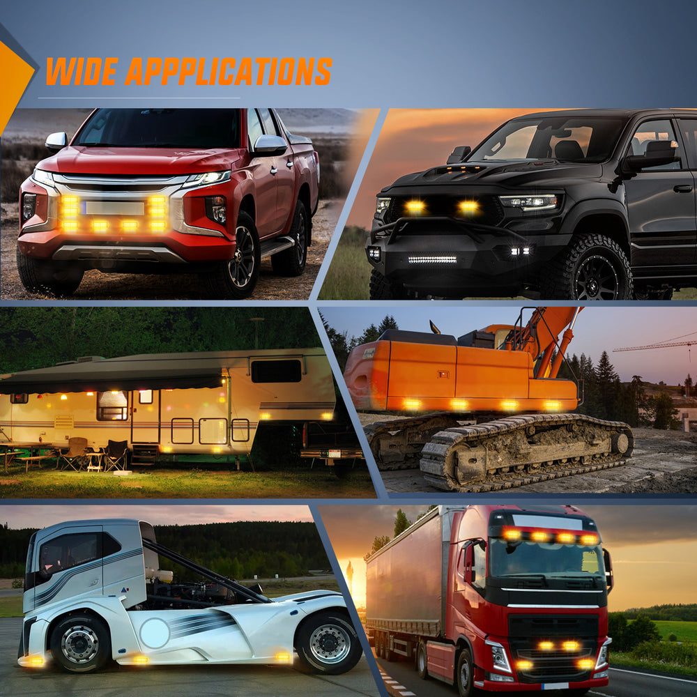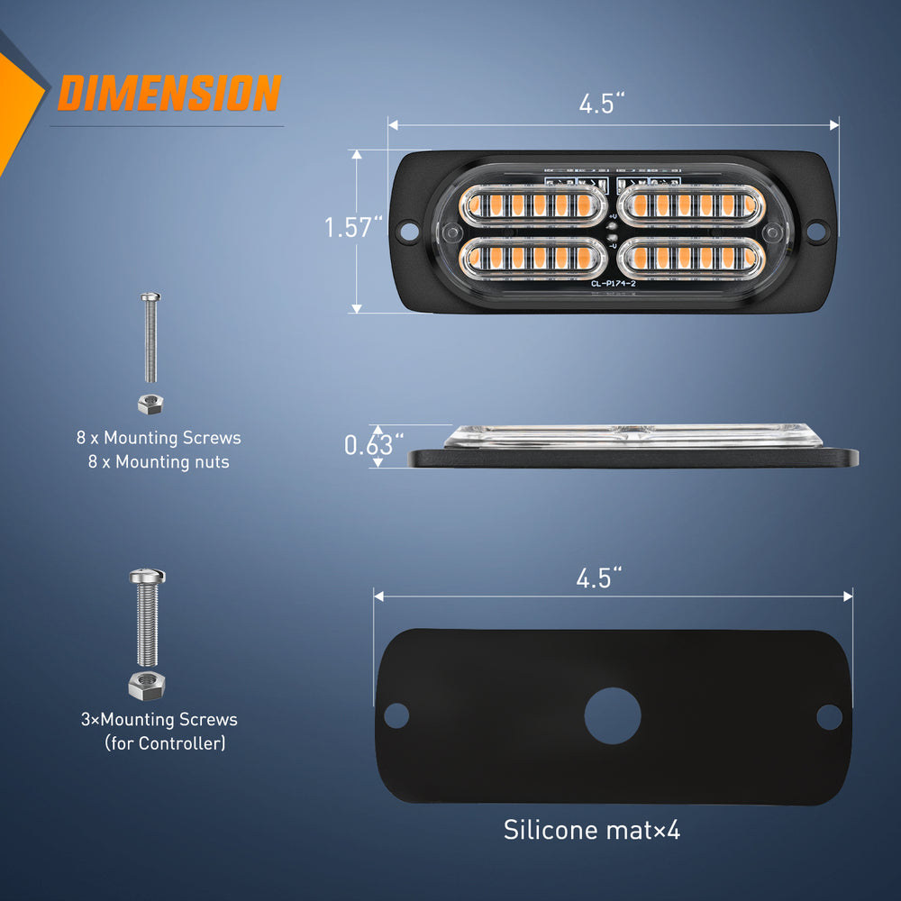 - Super Bright:4Pcs Surface Mount Amber Strobe Lights are consists of 4pcs double row 24 LED chips, provided maximum illuminate coverage and be visible from greater distance. Visible in daylight, midnight, rainy, foggy or snow days