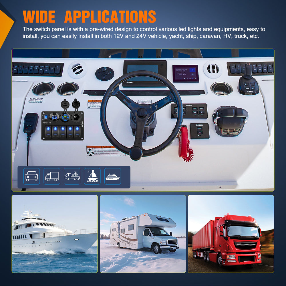 The rocker switch panel with pre-wired wiring harness for you to easily install in both 12V and 24V vehicles, yacht, ship, caravan, truck, etc.