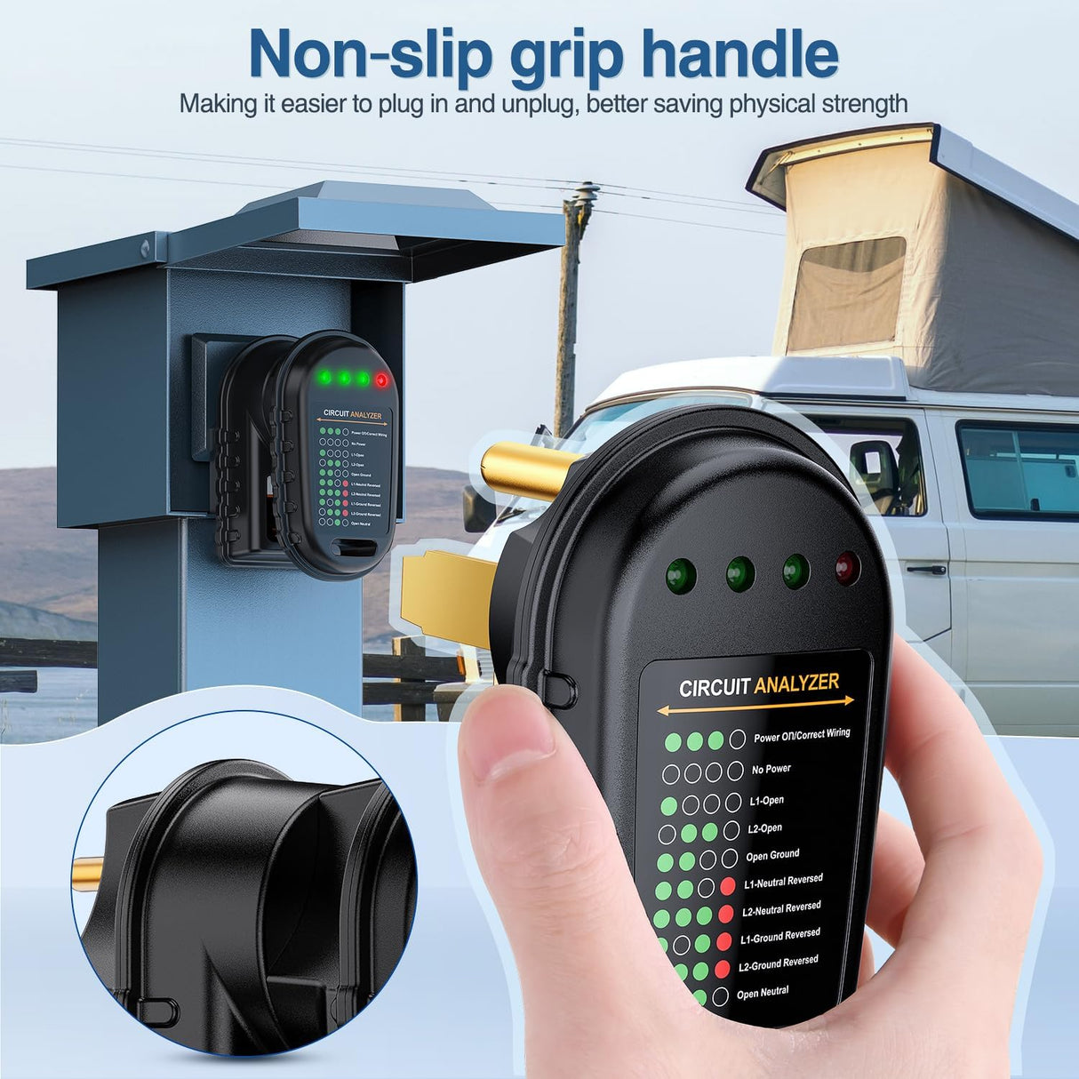• Circuit Analyzer: Designed with LED Indicator Light, which will identify and judge whether the power source is safe. The diagnostic chart provides following wiring condition: Power ON/Correct Wiring, NO Power, L1 Open, L2 Open, Open Ground, L1-Netural Reversed, L2-Netural Reversed, L1-Ground Reversed, L1-Ground Reversed, Open Neutral. If a wiring faulty pattern is indicated, please contact the park staff to fix the issue. If the LED pattern indicates the correct wiring, it is safe to plug in your RV.