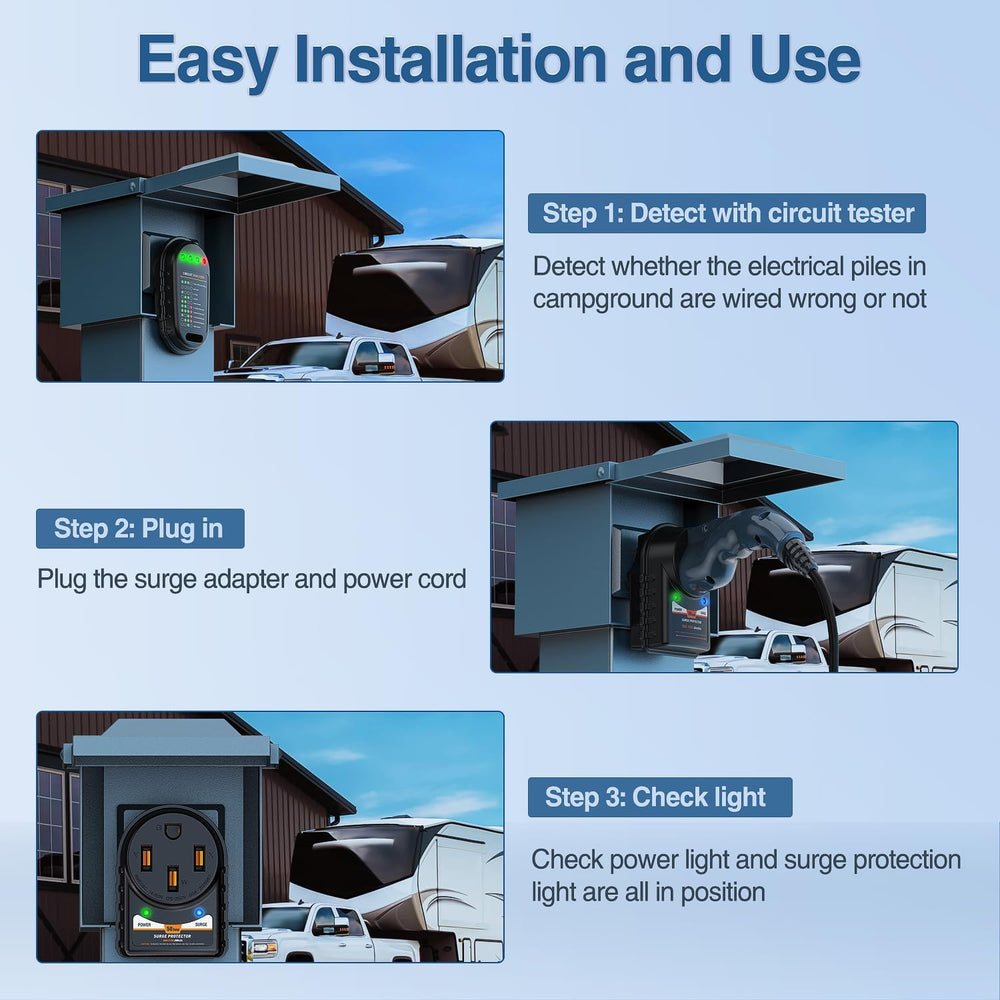 Step 1: Detect whether the electrical piles in the campground are wired wrong or not with circuit tester. Step 2: If the wiring is correct, plug in the surge adapter and power cord. Step 3: Check power light and surge protection light are all in position.