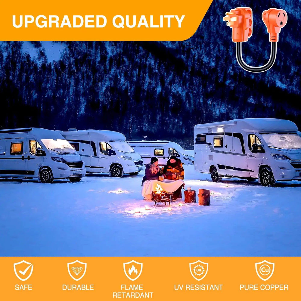 - 50 AMP (14-50R) male to 30 AMP (TT-30R) female heavy-duty power adapter, best adapter for all RVs running 30 amps, power supply for the refrigerator, air conditioner, microwave oven, roaster, and other household appliances.