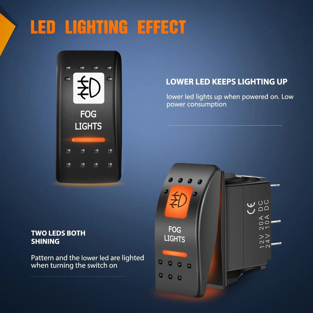 Wide Application: Standard 5 Pin switch, rated at 20amp/12VDC and 10amp/24VDC, available for upgrading most wiring harness to control Rock Lights, Led Light Bar, Led Work Lights, Fog Lamps, Headlights, Taillights and Auxiliary Lamps, etc.