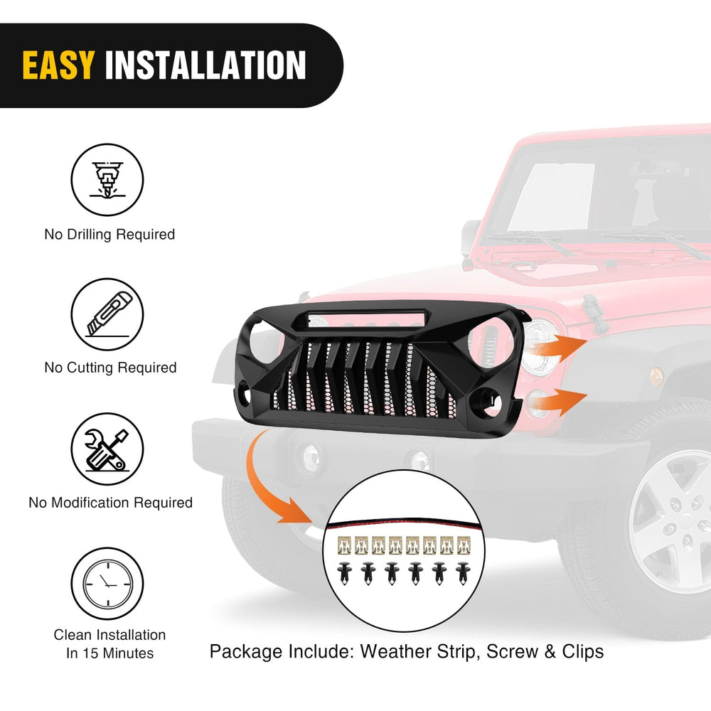 Front Bumper Grill Cover for 2007 2008 2009 2010 2011 2012 2013 2014 2015 2016 2017 2018 Wrangler JK/JKU Rubicon, & Sahara Sport with LED Work Light Pods Matte Black