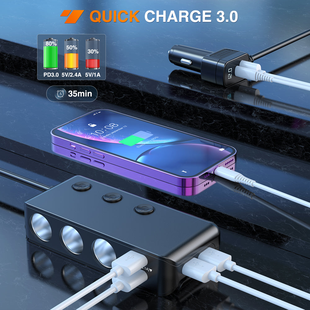 - On/Off Switch & LED Voltage Display: The one switch on cigarette lighter for 6 USB & 1 USB-C(PD30W), 3 independent on/off switches for each cigarette socket allow you to turn on or off the device without affecting other charging devices. The light LED voltmeter monitors the voltage of your car's battery in real-time.