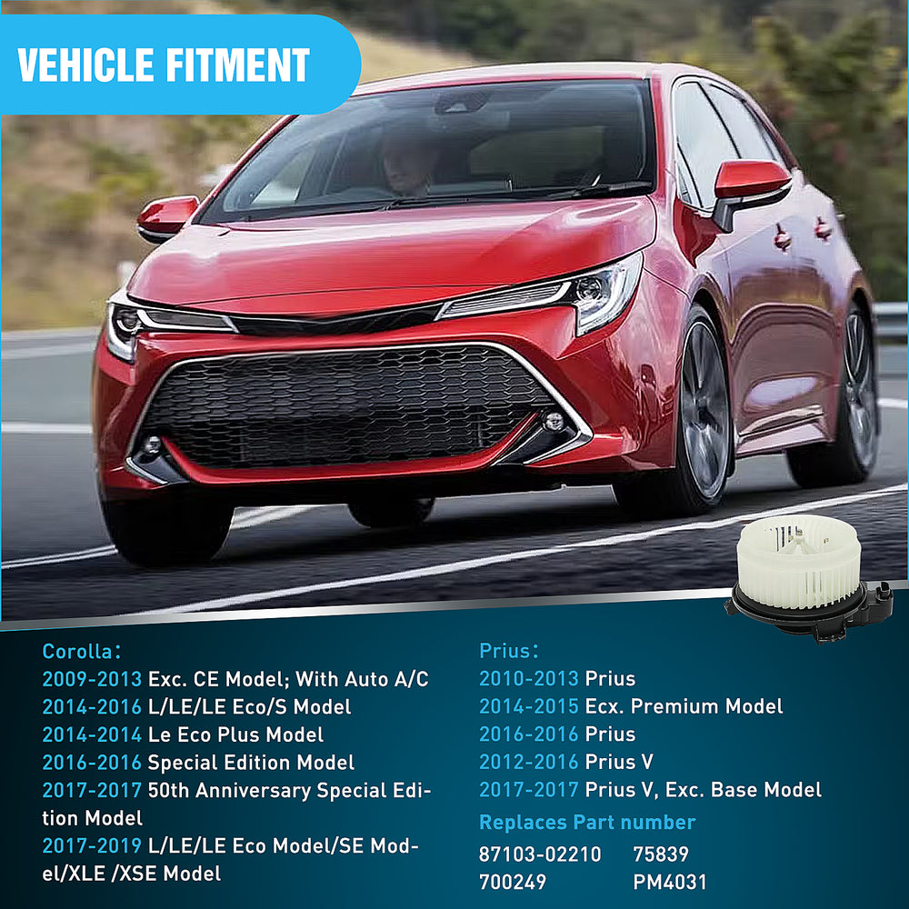 AC Heater Blower Motor Fan Assembly Fit for Toyota Corolla 2009-2018(Only for AUTO A/C), Prius 2010-2015, Prius V 2012-2017 (for 3 Prong Connect Only) Replace#87103-02210 700249 is backordered and will ship as soon as it is back in stock.