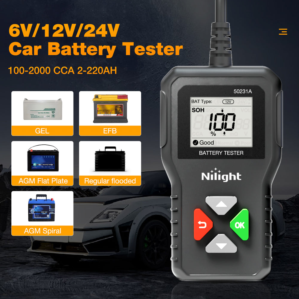 - 6V 12V 24V Battery Tester: Nilight battery tester can test all 6V 12V 24V 100-2000 CCA car batteries, support 2Ah-220Ah(Enter the corresponding CCA value on the battery before testing), including regular flooded(Regular battery), AGM flat plate(AGM tablet battery), AGM spiral(AGM winding battery), GEL and EFB batteries, battery analyzer for cars trucks etc.(Not suitable for deep cycle batteries)