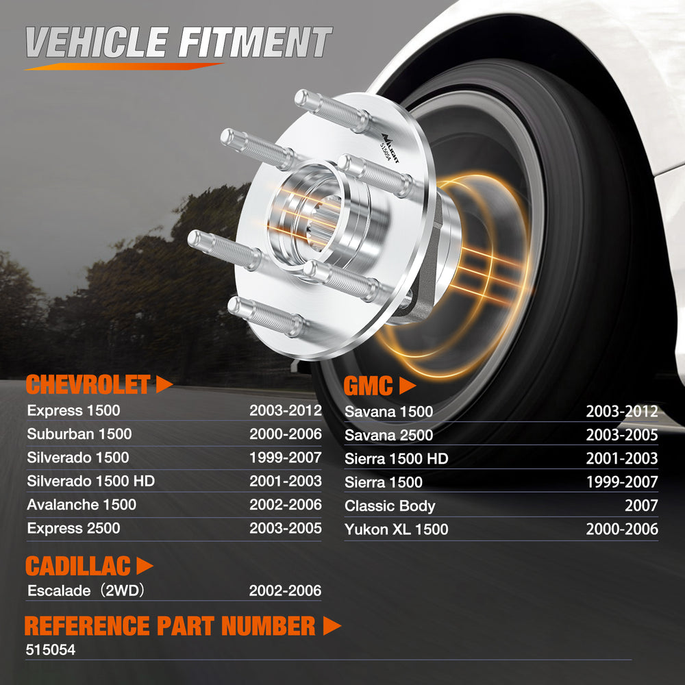 - Vehicle Fitment: 515054 Wheel hub Compatible with 2003-2012 Chevrolet Express 1500 GMC Savana 1500,1999-2007 Chevrolet Silverado 1500, GMC Sierra, 2002-2006 Cadillac Escalade, 2000-2006 GMC Yukon(ONLY FITS 2WD)