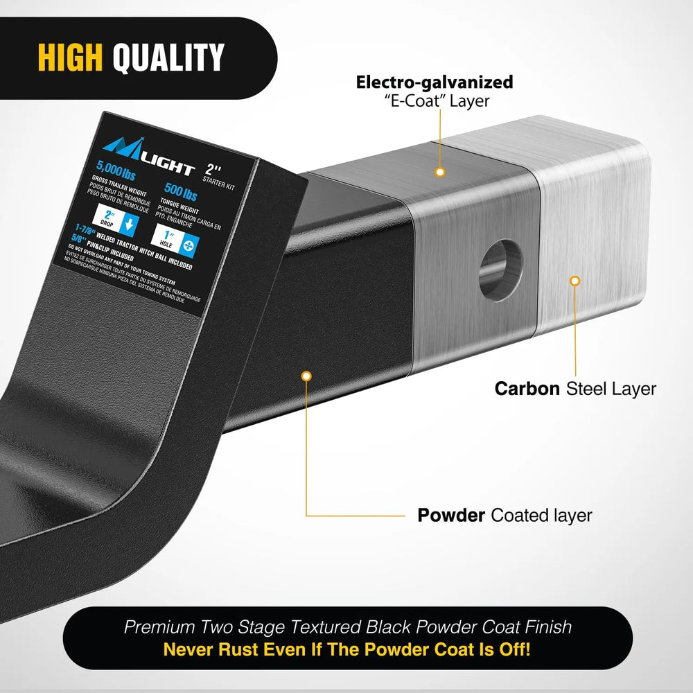 Heavy Duty Trailer Hitch: Offers a gross trailer weight capacity of up to 5,000 lbs and 500 pounds tongue weight, Perfect for towing trailer, campers, hauling motorcycles and ATVs with 2 inch standard hitch receiver.