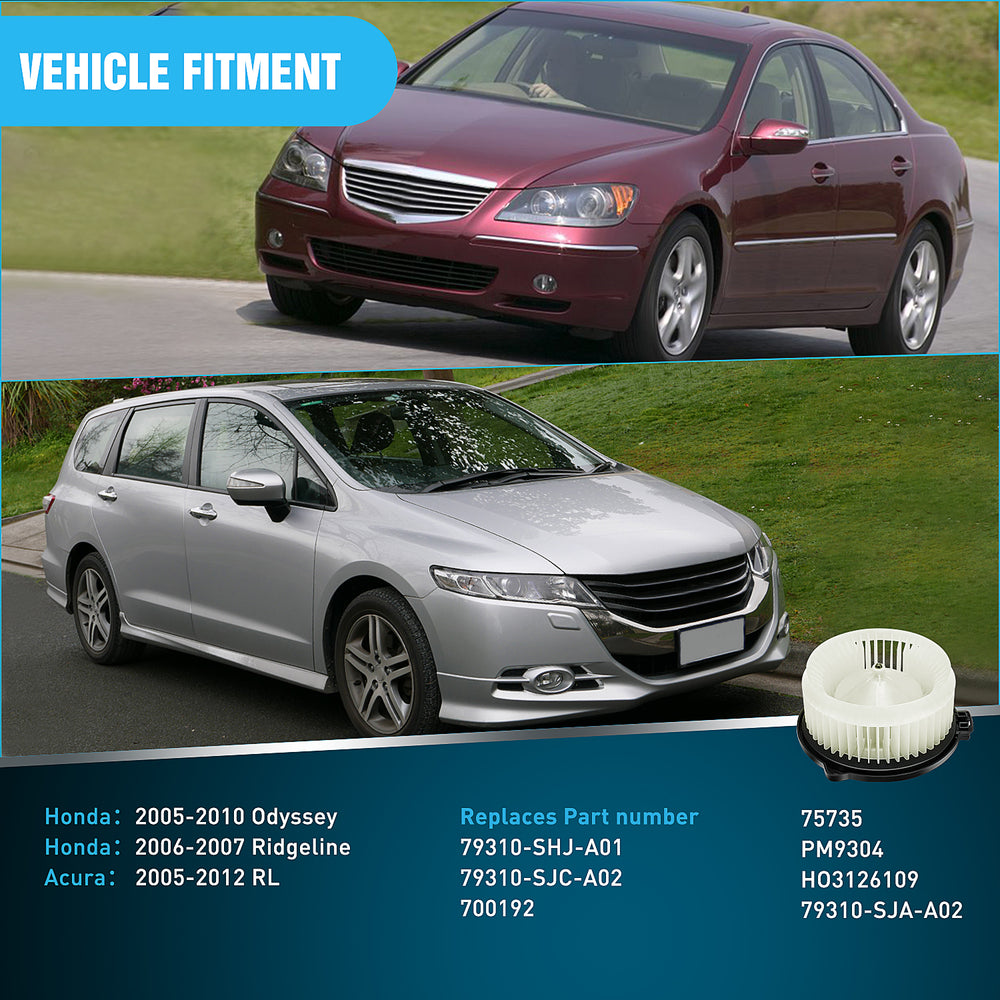 HVAC Blower Motor with Fan Fit for Hon-da Odyssey 2005 2006 2007 2008 2009 2010,Acura RL 2005-2011 2012 Replaces 79310-SHJ-A01, 79310-SJC-A02, 700192, 75735, PM9304 is backordered and will ship as soon as it is back in stock.