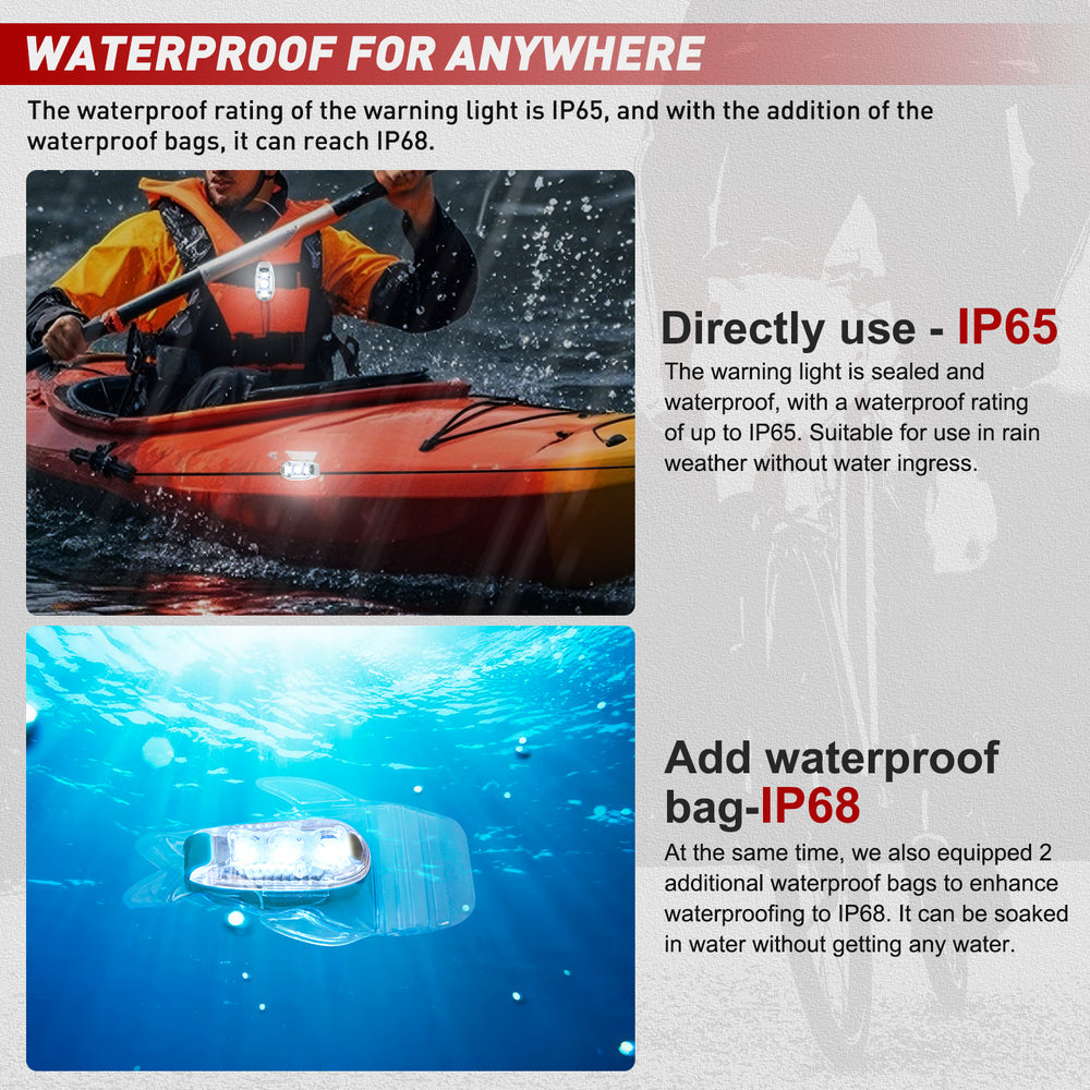 - Improve Waterproof Level: The safety lights itself has IP65 waterproof grade, so there is no need to worry about water ingress and failure in rainstorm and other severe weather. At the same time, we also provide waterproof bags to make the lights waterproof to IP68, allowing it to be used in swimming and diving activities