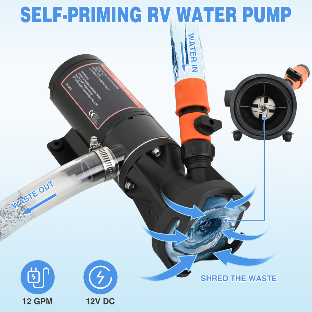 Macerator Pump for RV 12V 12GPM Portable Quick Release Self-Priming RV Macerator Pump for Sewage Waste sewer Pump Kit with Hose Fittings Discharge Port Carry Bag for Camper Boat Kitchen Marine