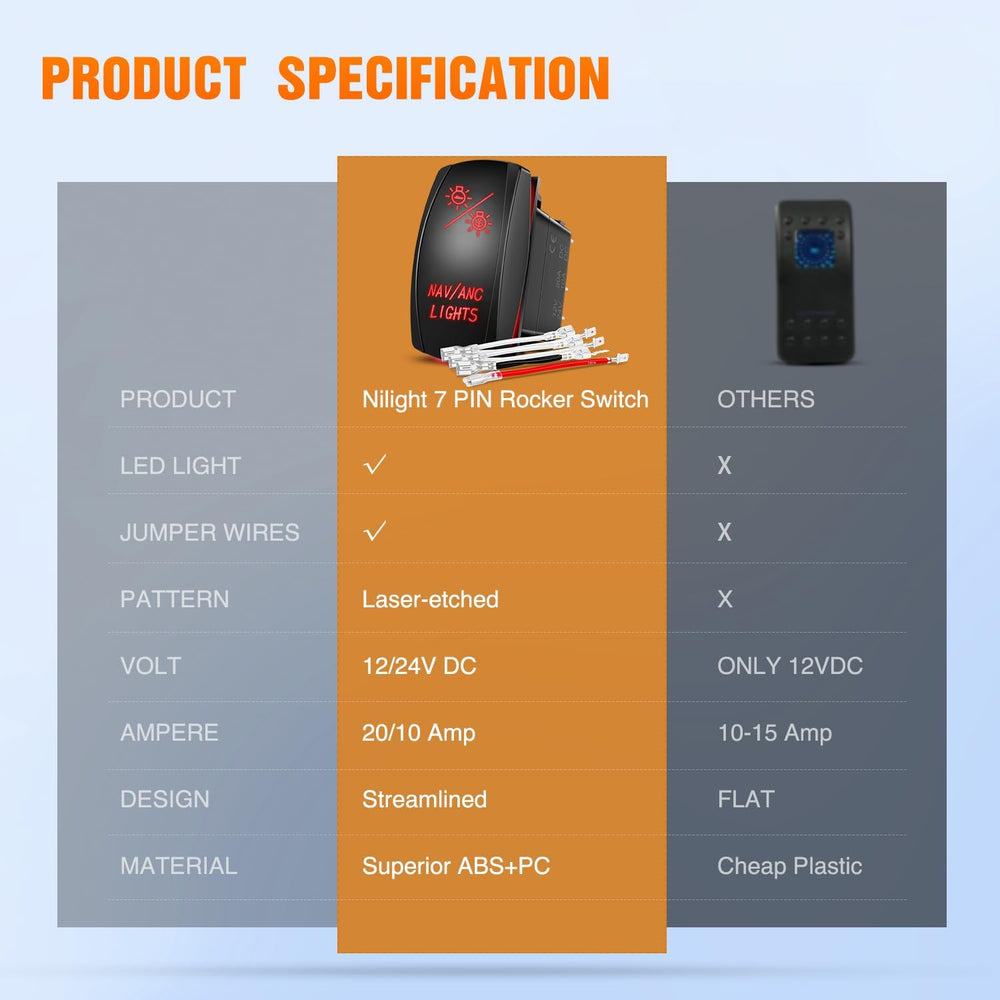 NAV/ANC Rocker Switch 7Pin Navigation Anchor Lights Toggle On Off DPDT Laser Etched 12V 24V Jumper Wires for ARB Carling NARVA Style Marine Boat Ship Vessel – Nilight