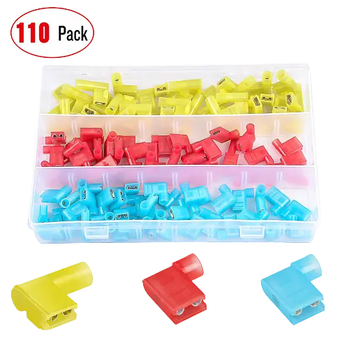 110pcs nylon flag wire connectors are packed in a durable plastic box with 3 departments for easy storage and well organization.
