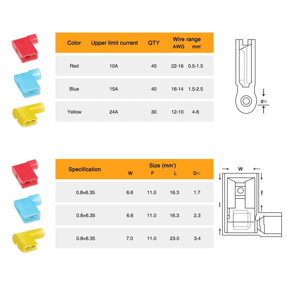 - Type: Flag female splice terminals. Nylon fully insulated spade crimp terminal, suitable for 22-16 AWG (red) 0.5-1.5mm²/ 16-14 AWG (blue) 1.5-2.5mm²/ 12-10 am. W. Yellow) 4-6mm²