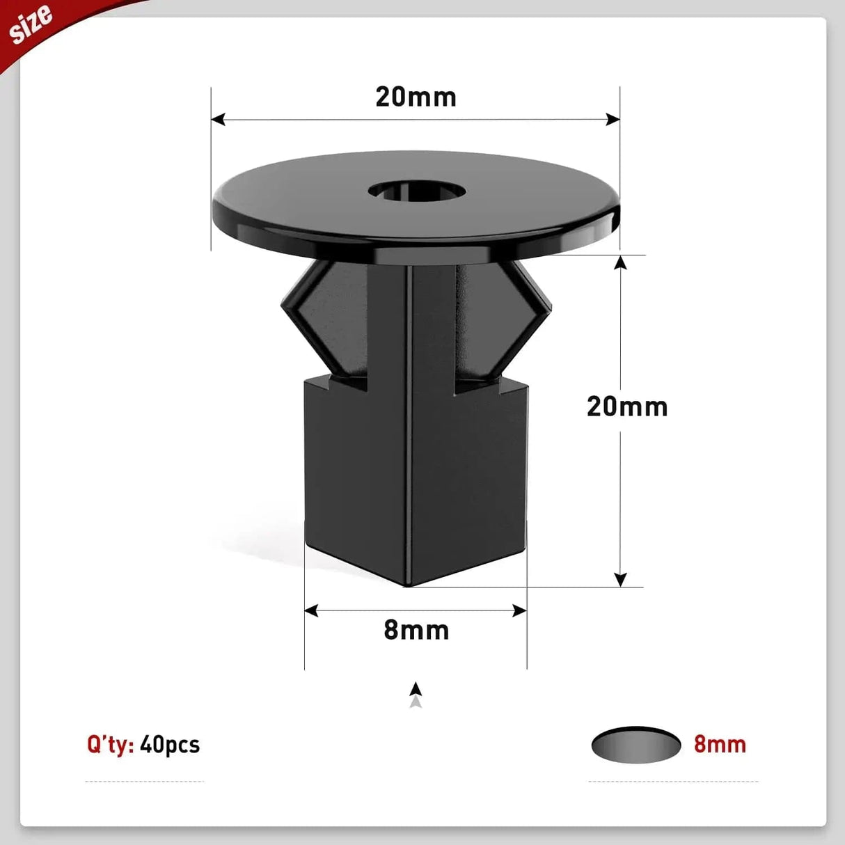 - The Same Size & Shape As Original: Head Diameter: 20mm, Stem Length: 18mm, Hole Size: 8mm Square. Fit perfectly in your car and use in the wheel well fender area to secure the fender liners