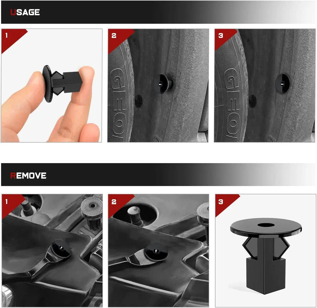 These are push-in type fastener clips. The design makes it easy to fasten bumper, fender flare and mud flap. All you need to do is a simple push, very convenient to use.