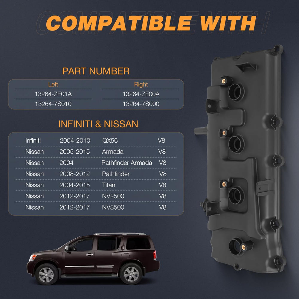 Pair Engine Valve Cover with Gasket for Nissan NV2500 NV3500 2012-2017 Pathfinder 2004 Armada 2005-2015, Infiniti QX56 2004-2010 Valve Cover, V8 5.6L Engine is backordered and will ship as soon as it is back in stock.