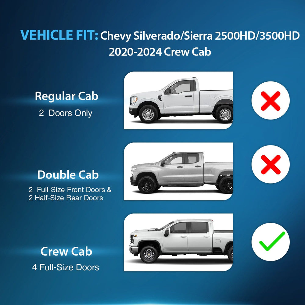 - Fitment: Chevy Silverado/Sierra 2500HD/3500HD 2020 2021 2022 2023 2024 2025 Crew Cab
