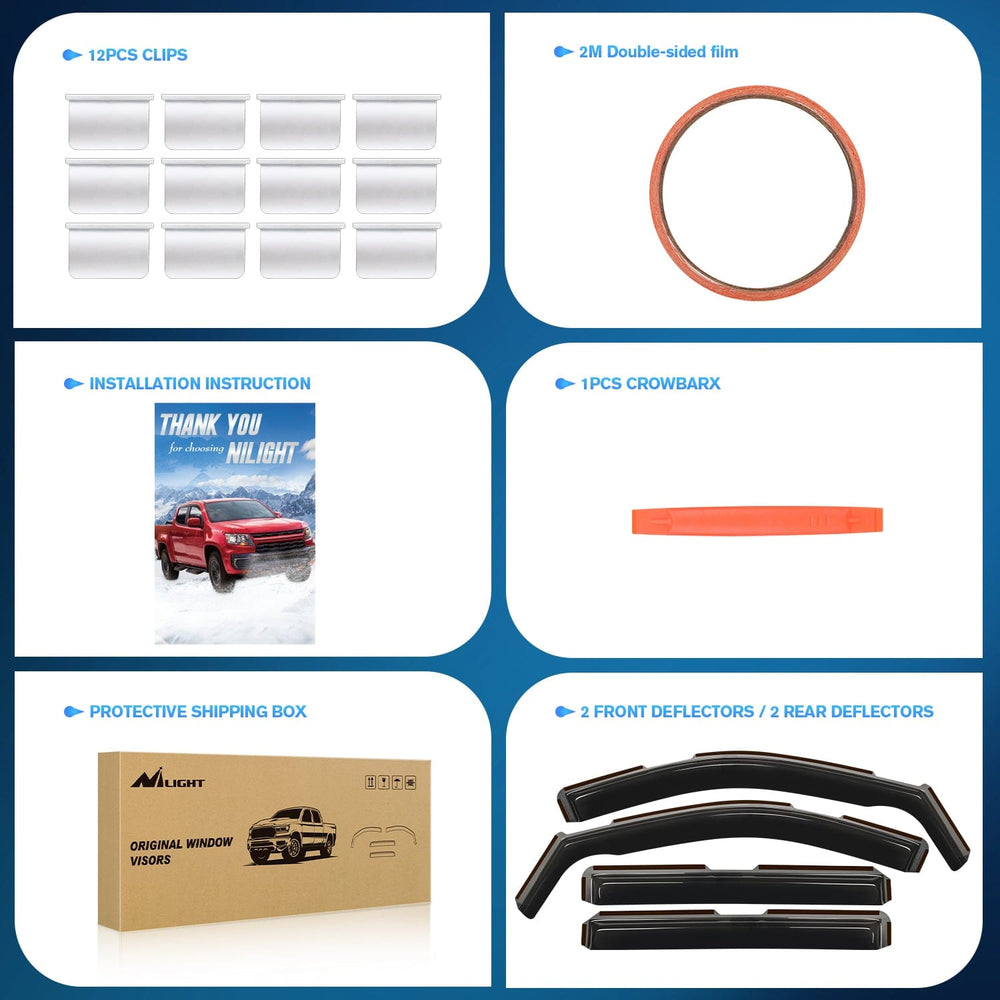 - Advantage: Nilight window deflectors are great for all weather conditions,help improve ventilation inside and outside your car to reduce mirror and window fogging while increasing air circulation。With our side window deflectors, it deflects the rain and noise away from your windows to make your driving more enjoyable