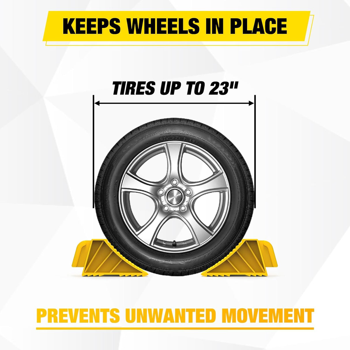 - Widely Used: Suitable for tires up to 23" in diameter. The wheel chocks prevent unnecessary movement, the wheel docks prevent trailer wheel sinking, making them ideal for securing recreational vehicles, campers, boats and single axle mobile trailers