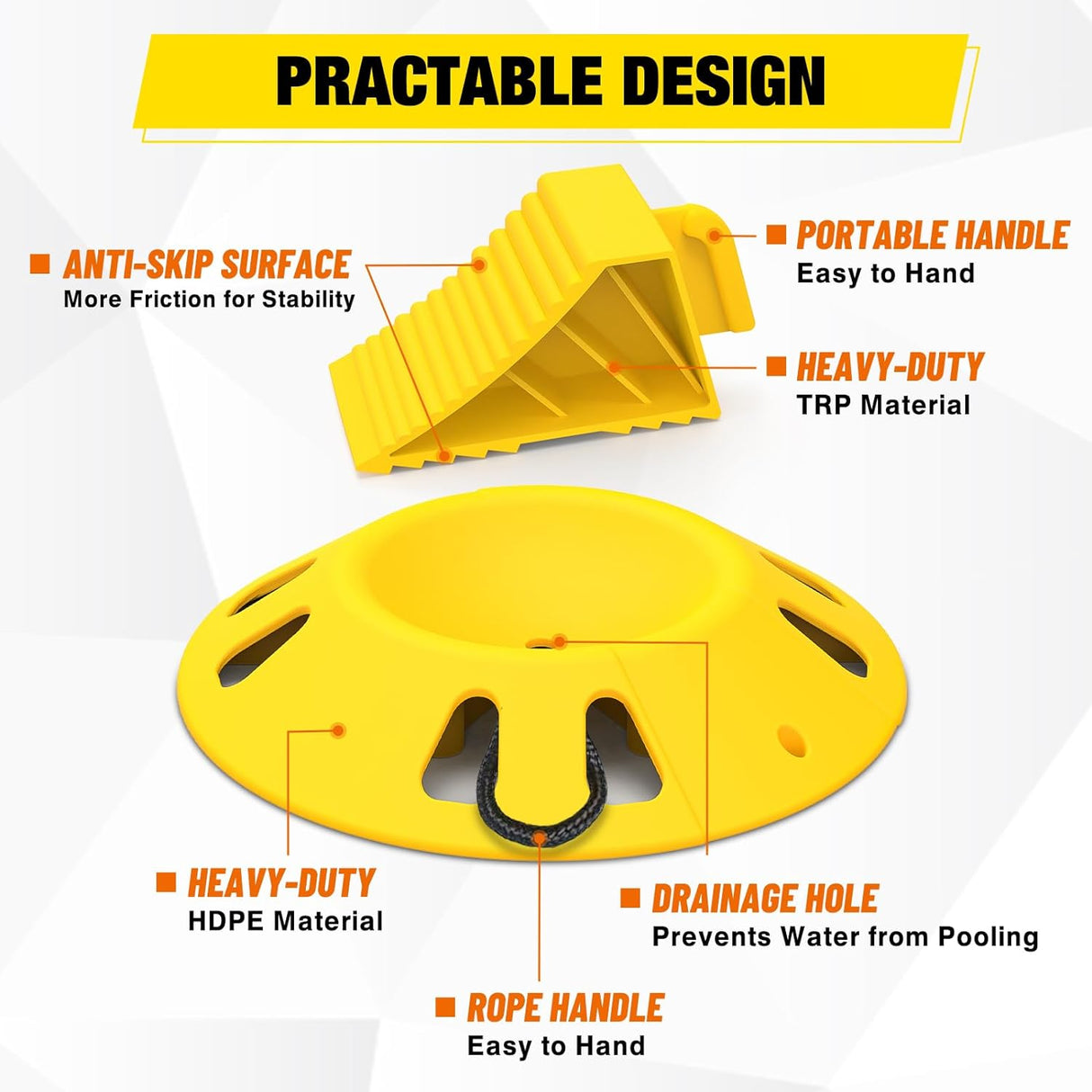- Durable and Secure: The wheel chocks are constructed of thermoplastic rubber, while the wheel dock is made of high-density polyethylene. UV-resistant and crack-resistant, premium material ensure durability and a long service life