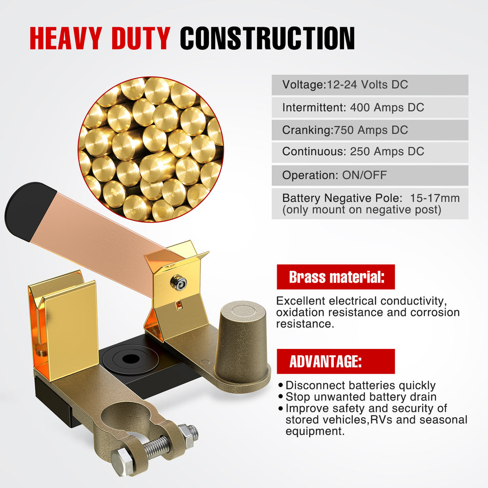 - Easy To Install And Use: Assemble the battery shut-off switch to the negative cable. Turns the power on and off by just lifting the lever up or down, on/off 2 position. Able to handle 12-24V Battery of 250A continuous and 750A momentary at DC 12V.