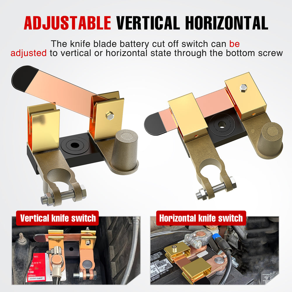 - Widely Used: The top & side post adjustable knife blade master switch is suitable for use with a standard 15-17mm cone top battery negative terminal. Fit for 6v 12v 24v cars, trucks, RVs, and boat Batteries, as well as batteries for other electrical equipment.