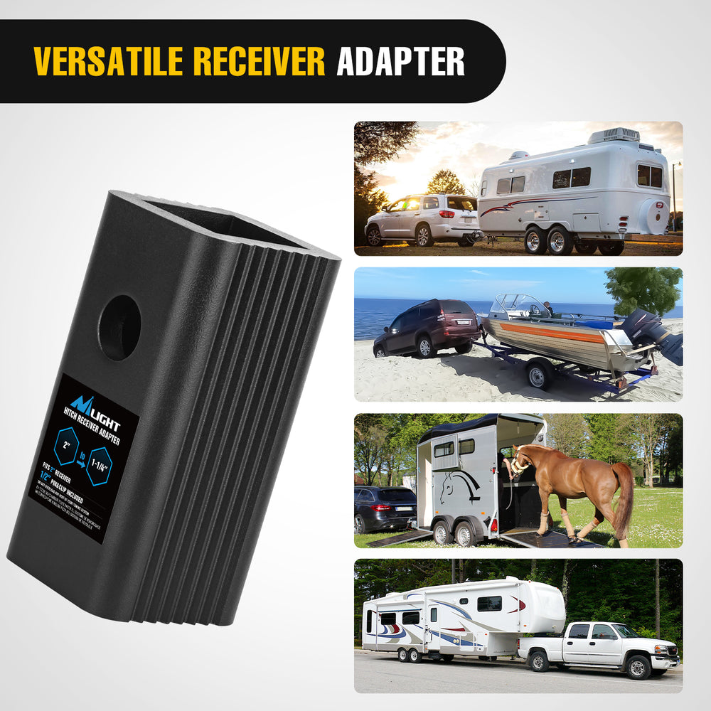 - Versatile fit: Nilight trailer hitch adapter converts 2 inch to 1-1/4 inch hitch receivers. Thanks to the UNIQUE interface design, you Do Not need to worry about the reducer slipping overly into the hook tube. Besides, it allows you to easily take out the adapter.